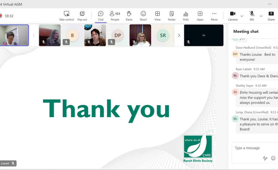 Dr. Louise Greenberg, board chair, began the meeting with the land acknowledgement of Treaty 4 and Treaty 6 territories, followed by the approval of the agenda and minutes from the 2023 Ranch Ehrlo AGM.
