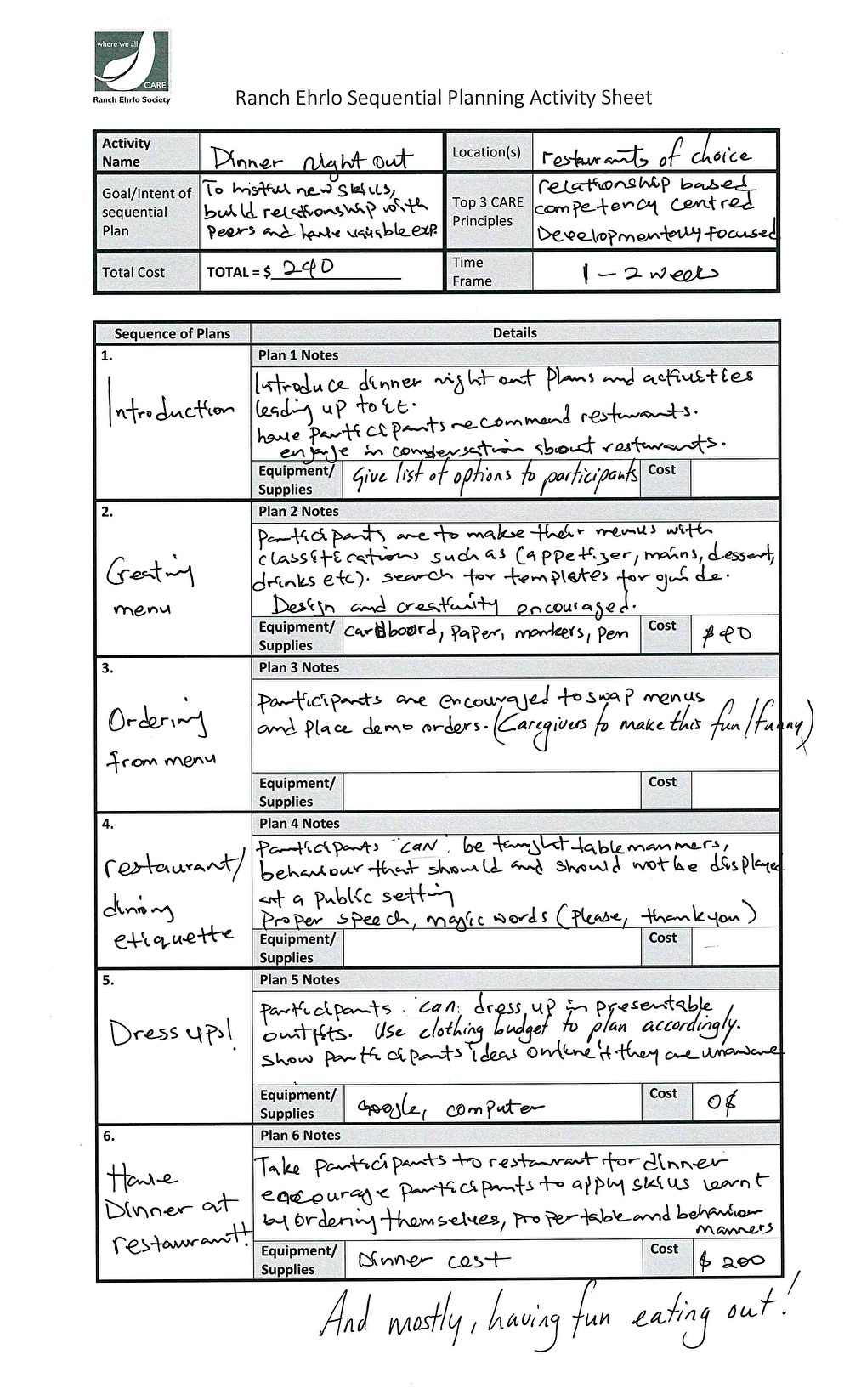 It’s easy to simplify an activity and not consider what makes it possible, what makes it worthy, and what makes it challenging, but our staff make every effort to plan these activities with therapeutic outcomes and success in mind. So, while supper at a restaurant may seem like a simple task, our staff know that for youth in care it can translate to challenges in conversation, compromise, and courtesy. Let’s take a closer look and see just what it takes to plan a successful supper night out for a group of 10 youth: