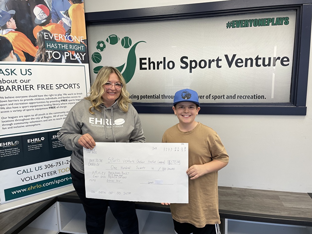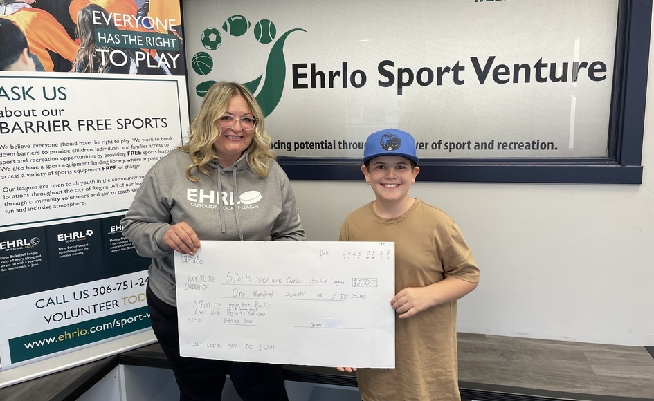 In total, Grady raised $170 through his sales. Grady attended Ehrlo Sport Venture to present his cheque and was given a tour of the lending library. He was eager to complete an interview with Gloria Patrick, ESV program manager, to round out his requirements for his class.